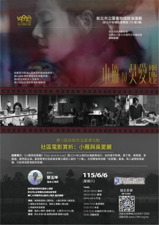 202604.20【活動訊息】 第13屆自殺防治宣導活動 社區電影賞析:小雁與吳愛麗 故事簡介: 《小雁與吳愛麗》(Yen and Ai-Lee)是2024年上映的台灣劇情長...