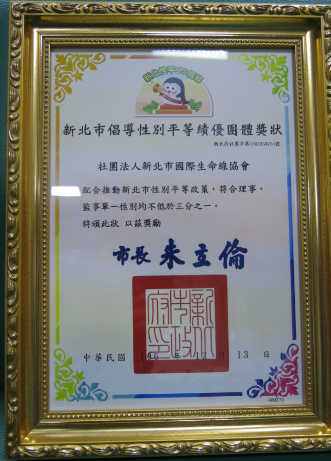 ●106年新北市倡導性別平等績優團體獎狀(新北市政府)