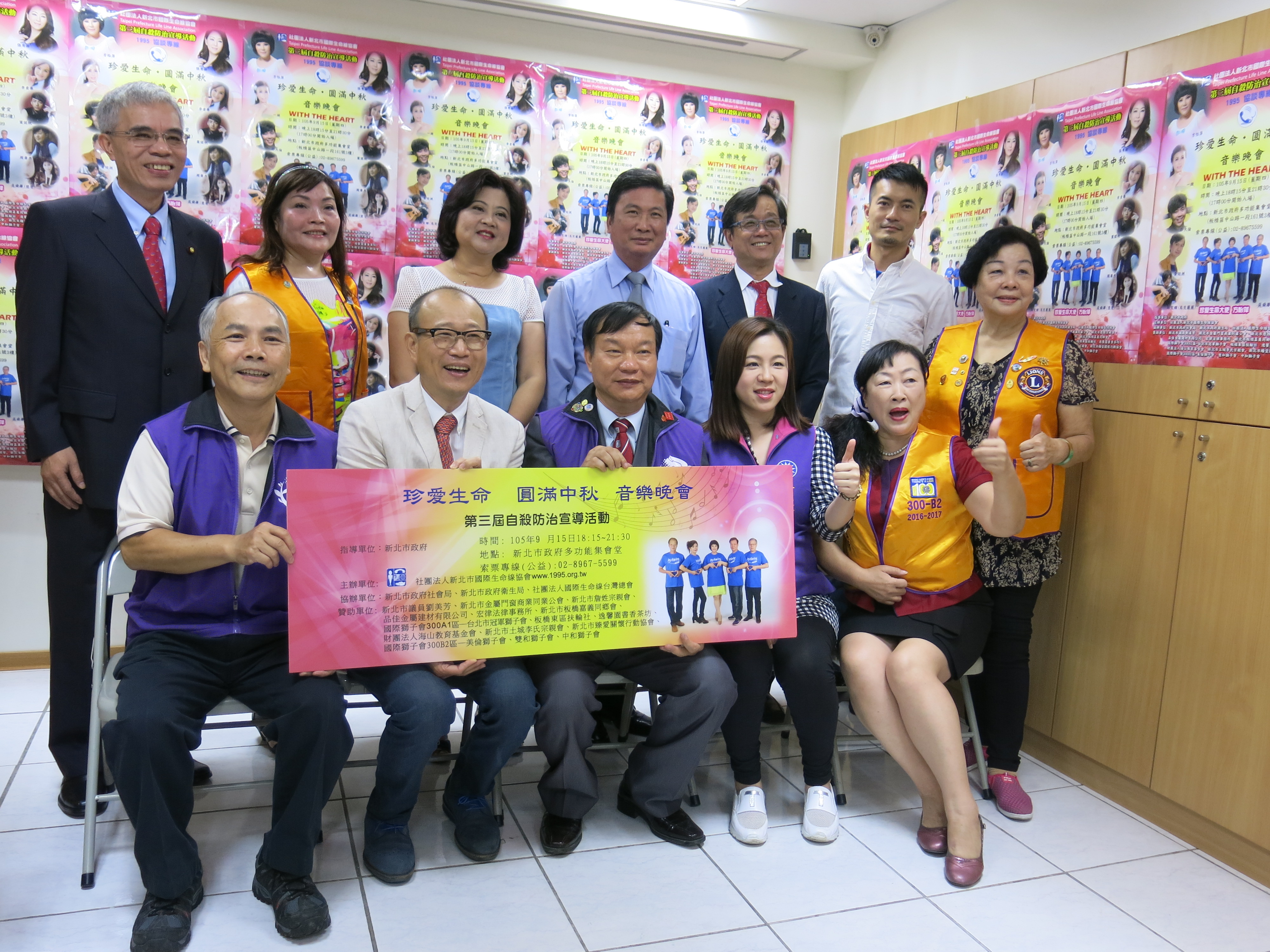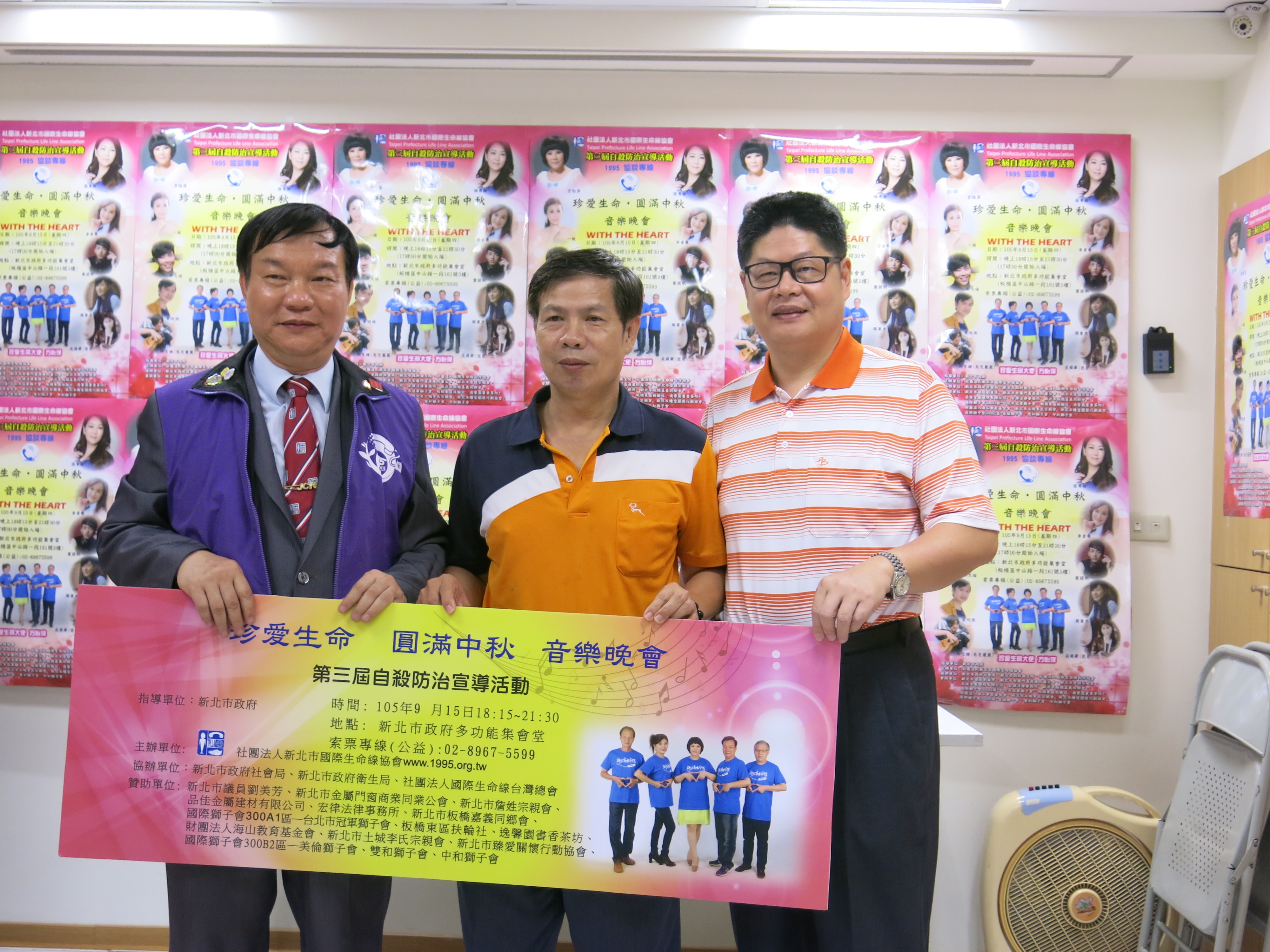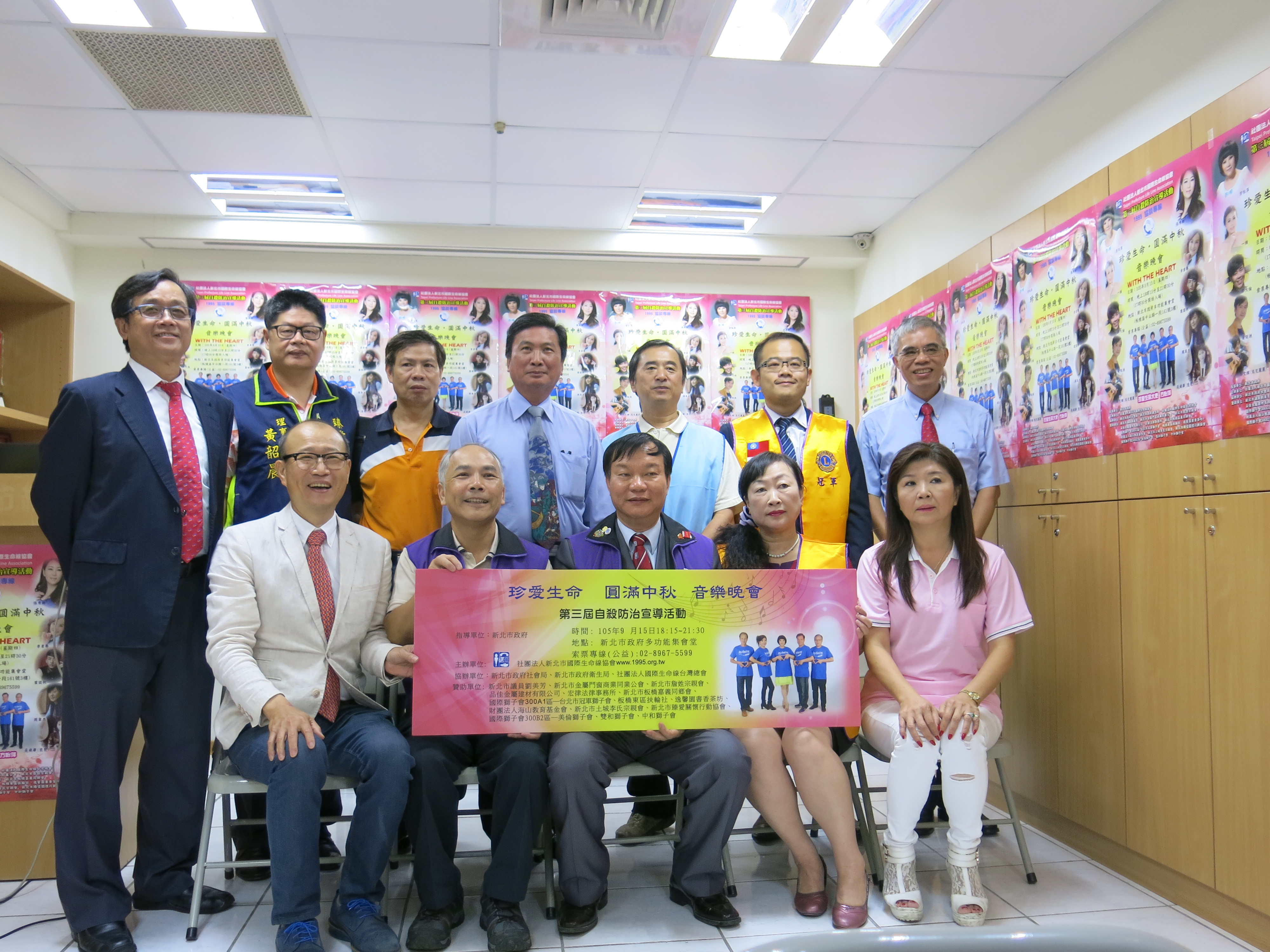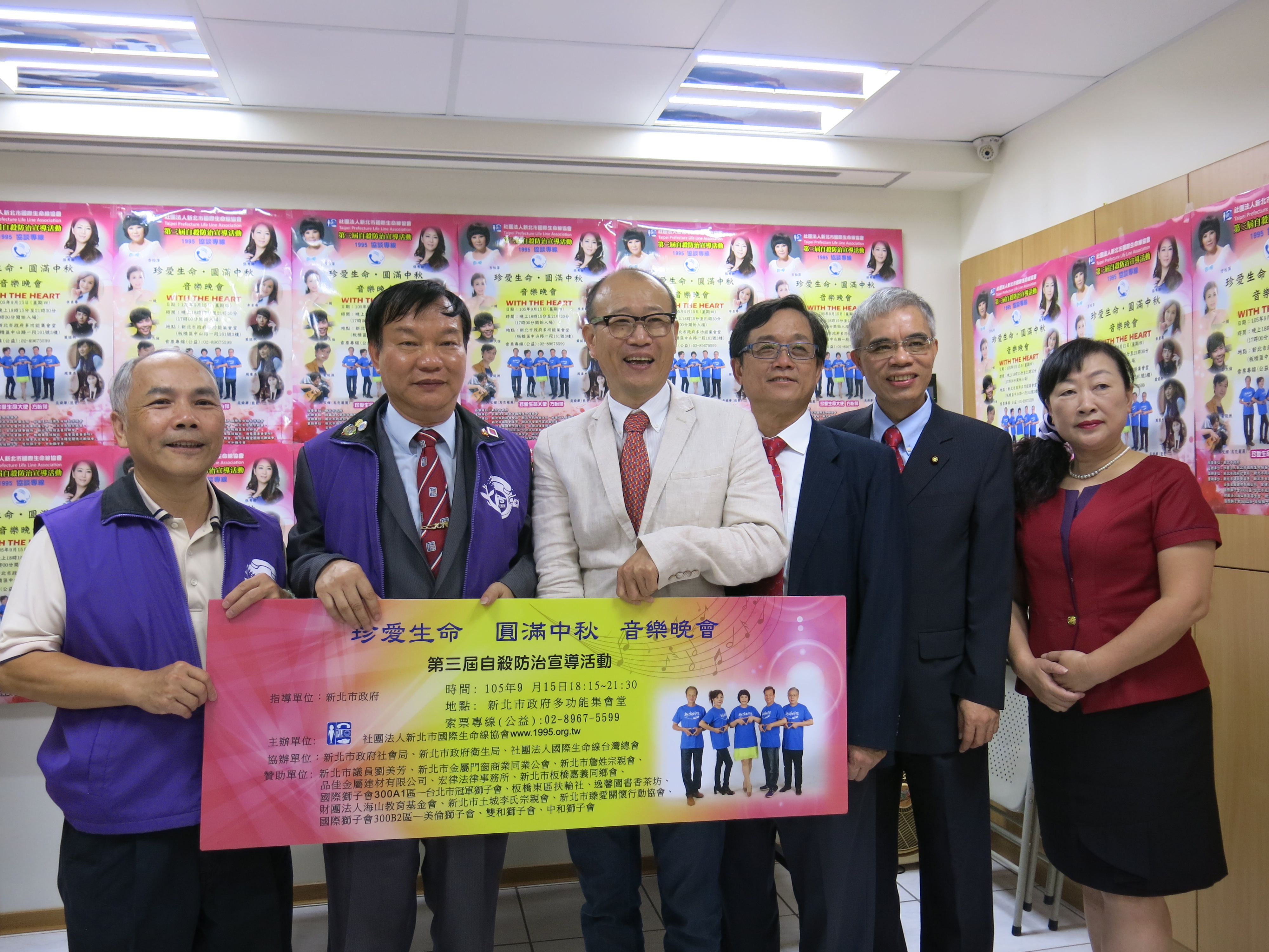 今(105)年賡續秉持著社會各界對宣導活動的肯定支持,廣邀職業公會、公司行號、事務所、社會團體(獅子會、扶輪社、社會服務及慈善團體)、宗親會、同鄉會、教育基金會等加入贊助單位,配合世界自殺防治日之主題「聯繫Connect、溝通Communicate、關懷Care」,選定在9月15日(星期四)中秋節晚上假新北市政府多功能集會堂,舉辦「第三屆自殺防治宣導活動:珍愛生命.圓滿中秋」音樂晚會,此次音樂晚會因屬公益性質,特邀請社會福利團體於9月2日在協會舉行贈票儀式,讓這份愛的饗宴也能夠分享給社會弱勢族群。