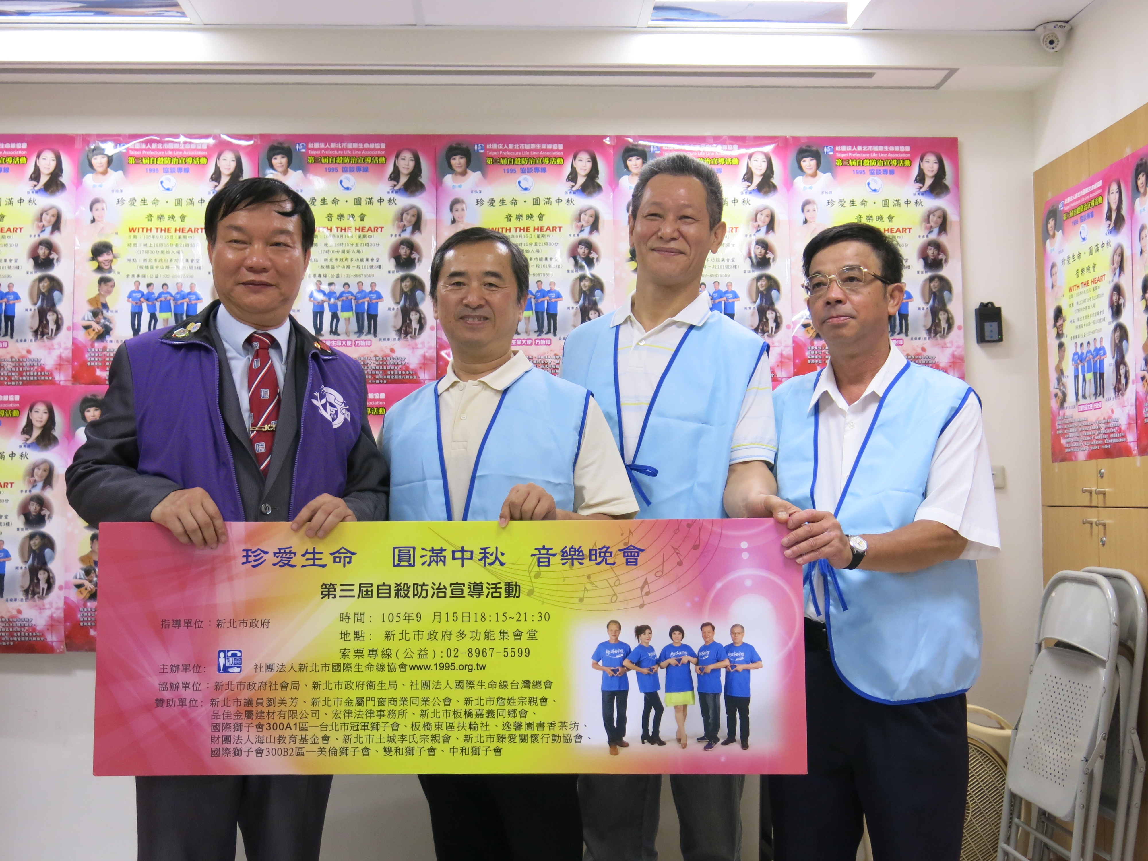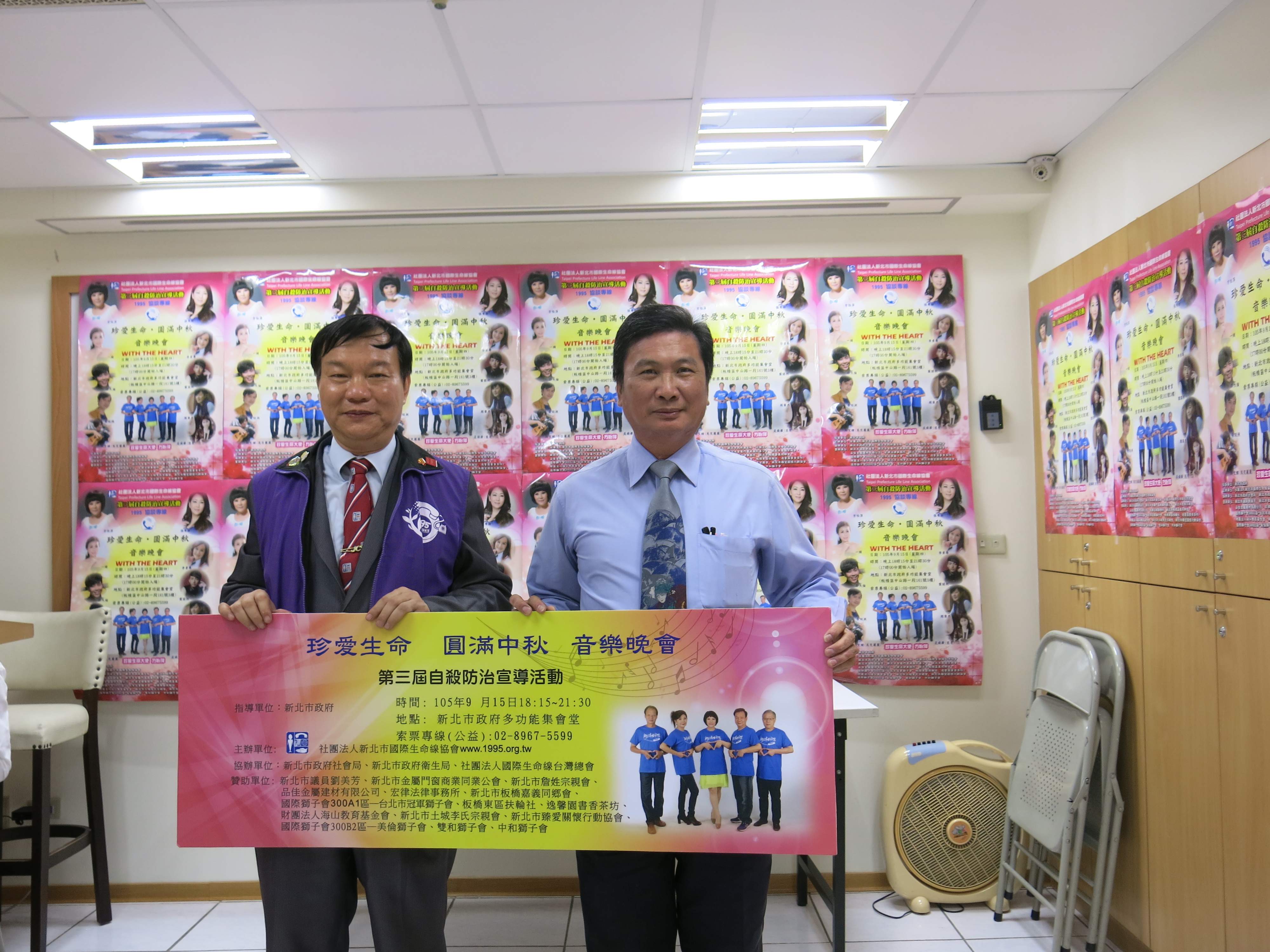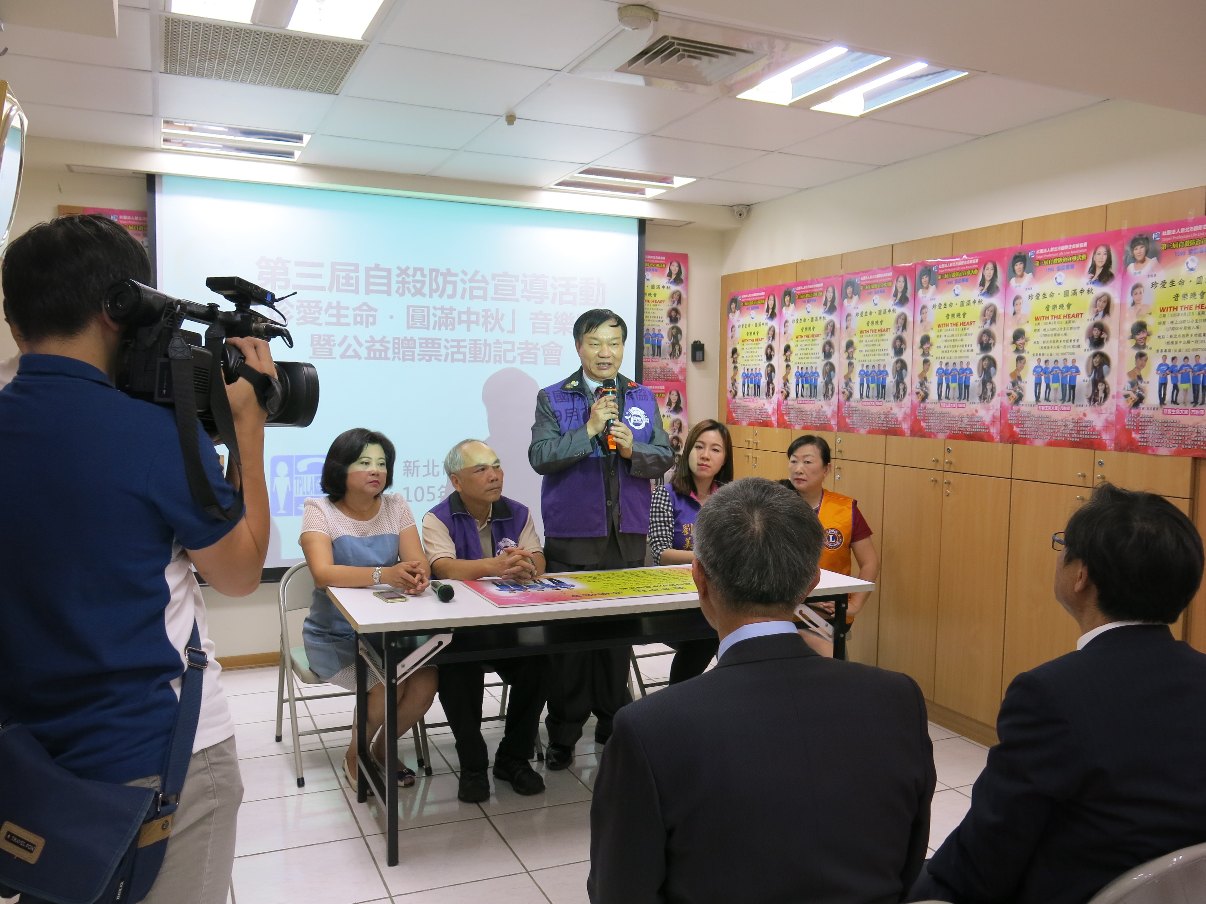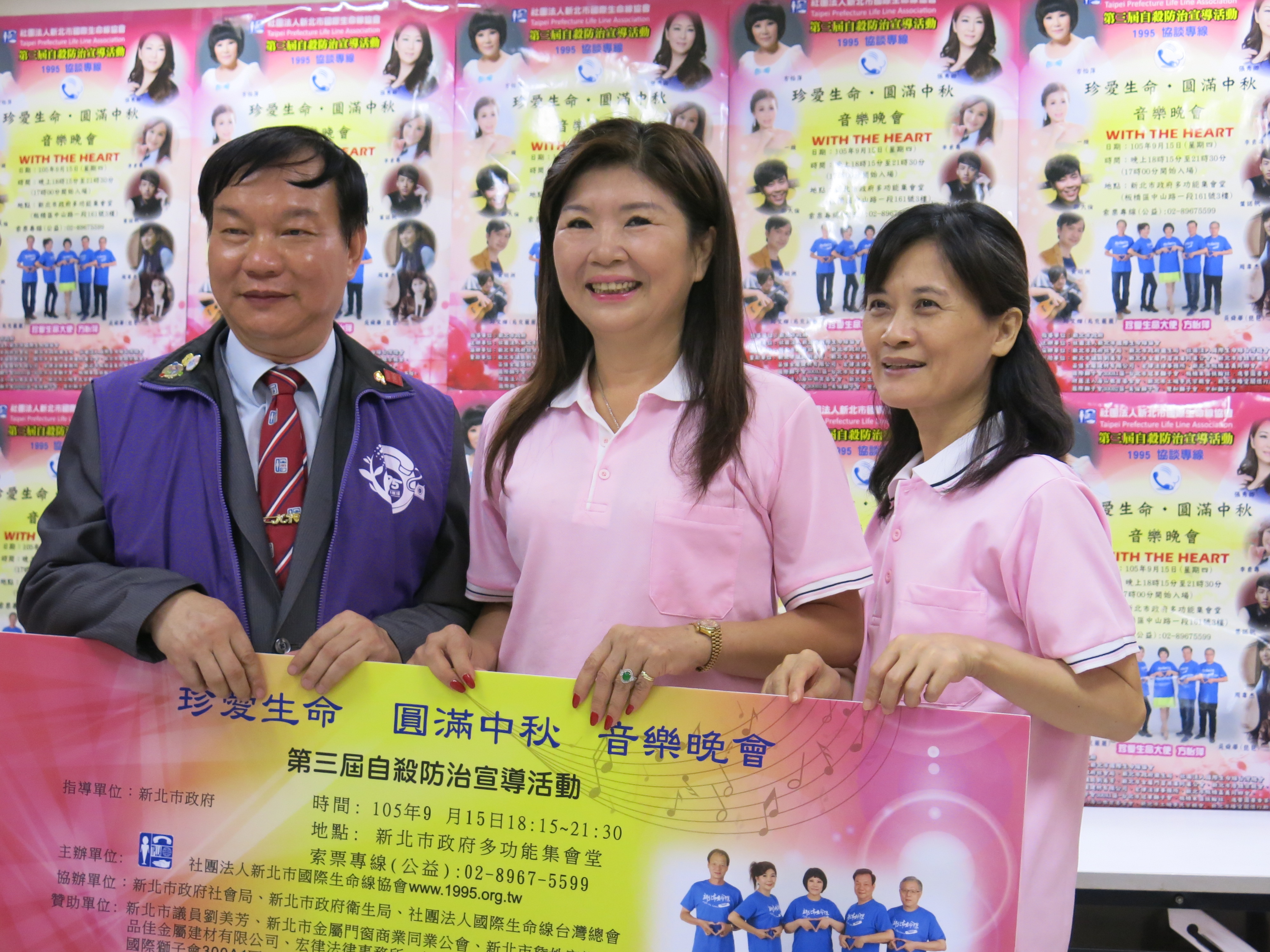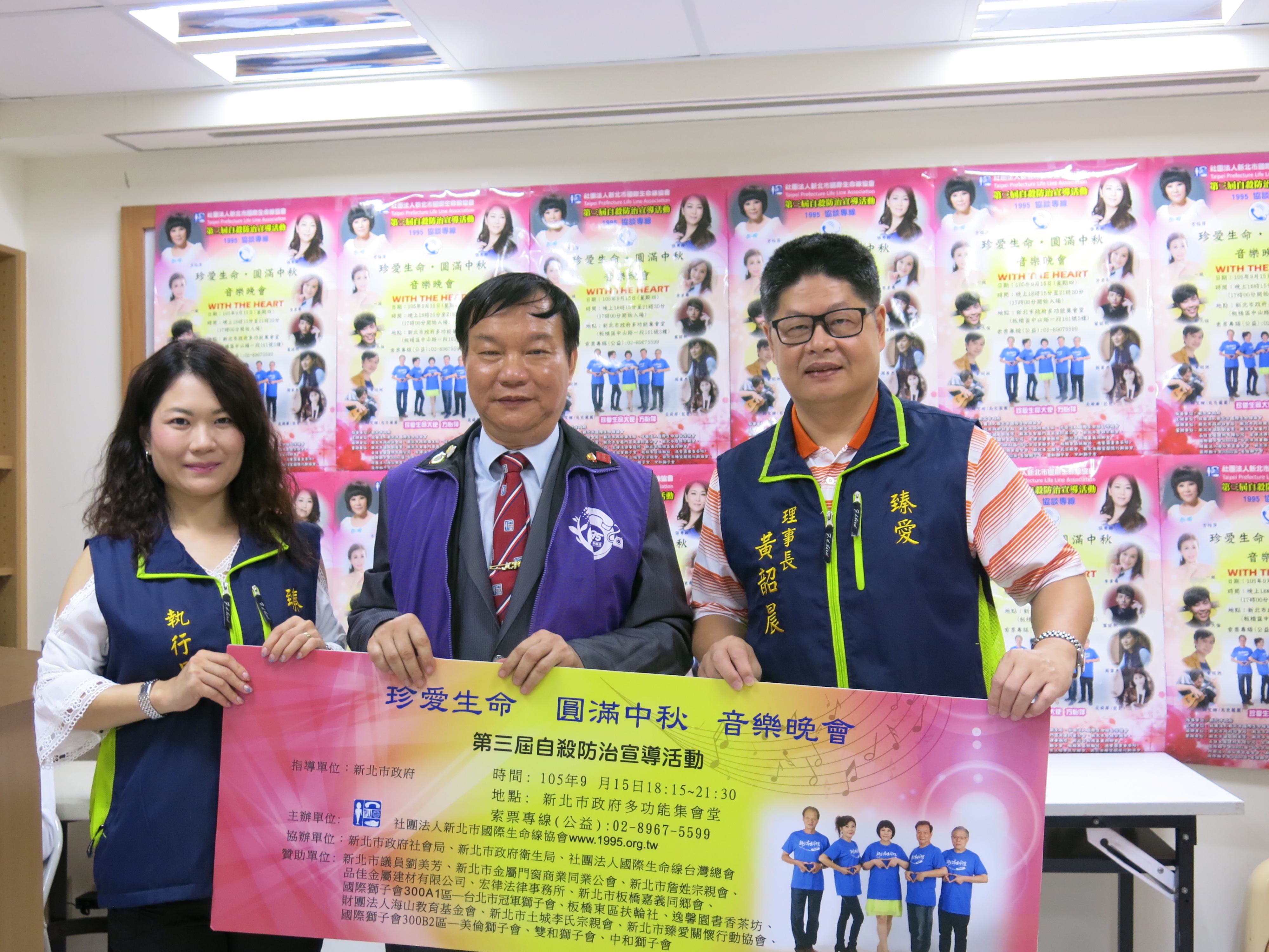 今(105)年賡續秉持著社會各界對宣導活動的肯定支持,廣邀職業公會、公司行號、事務所、社會團體(獅子會、扶輪社、社會服務及慈善團體)、宗親會、同鄉會、教育基金會等加入贊助單位,配合世界自殺防治日之主題「聯繫Connect、溝通Communicate、關懷Care」,選定在9月15日(星期四)中秋節晚上假新北市政府多功能集會堂,舉辦「第三屆自殺防治宣導活動:珍愛生命.圓滿中秋」音樂晚會,此次音樂晚會因屬公益性質,特邀請社會福利團體於9月2日在協會舉行贈票儀式,讓這份愛的饗宴也能夠分享給社會弱勢族群。