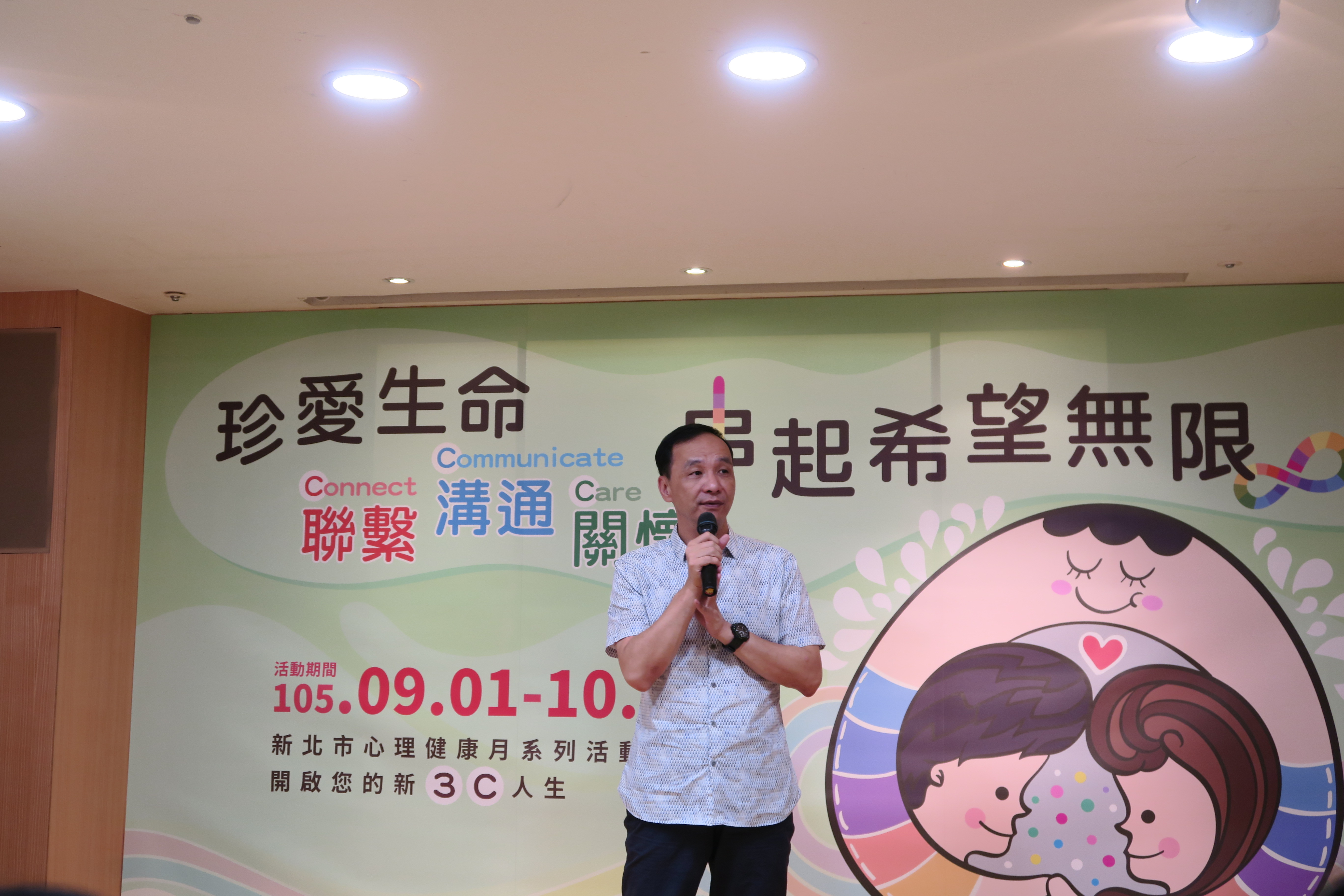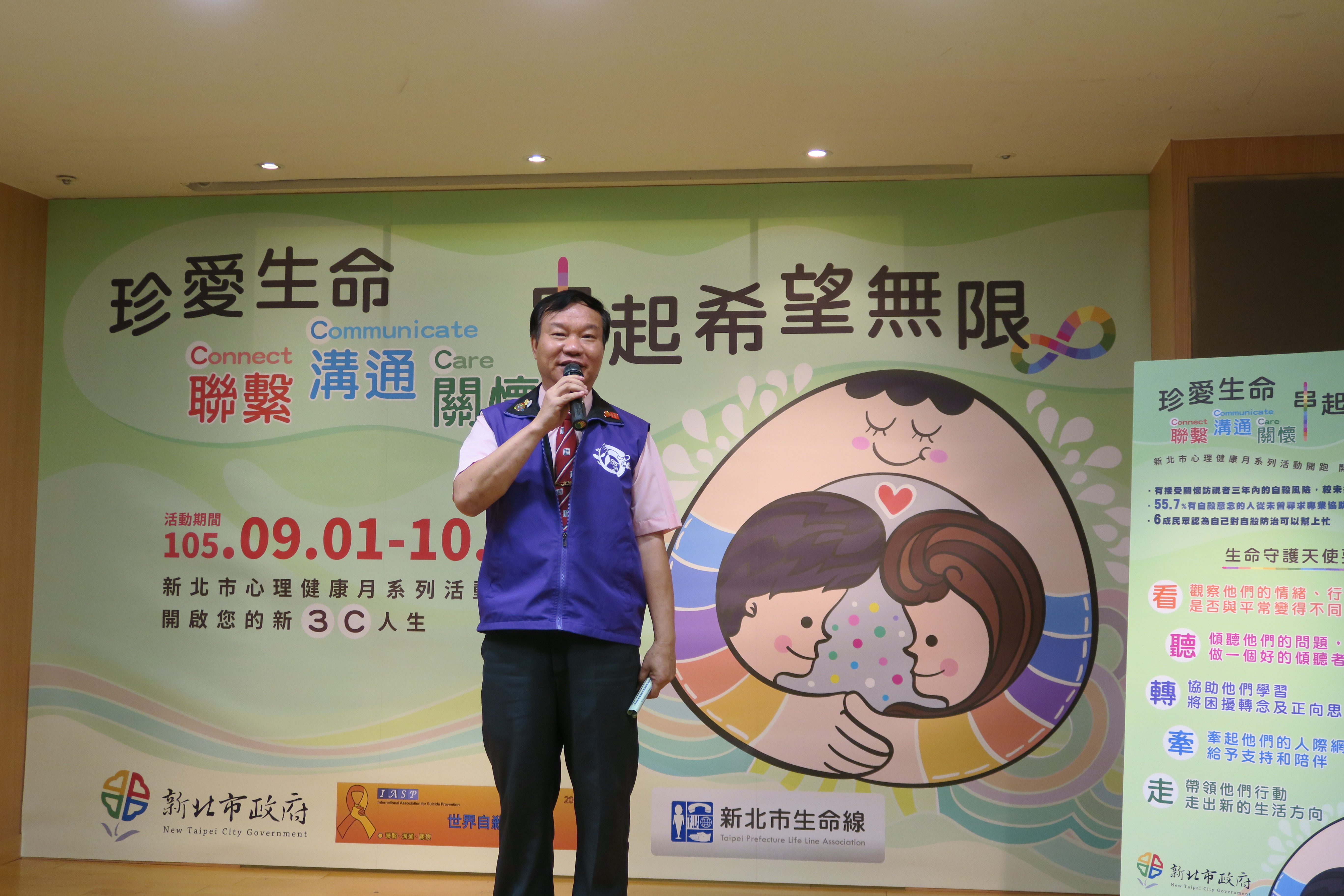 ●理事長代表協會上台致詞,感謝市政府長期以來對生命線服務的肯定與支持,自殺防治宣導活動今年已邁入第三年,將於9月15日中秋節當天在多功能集會堂舉行,今年以音樂會的方式呈現,邀請多位藝人演唱歌曲並進行心理衛生、自殺防治宣導;另外,介紹9月24日在江翠國小舉行的社區電影賞析活動,誠摯邀請新北市民前來共襄盛舉。